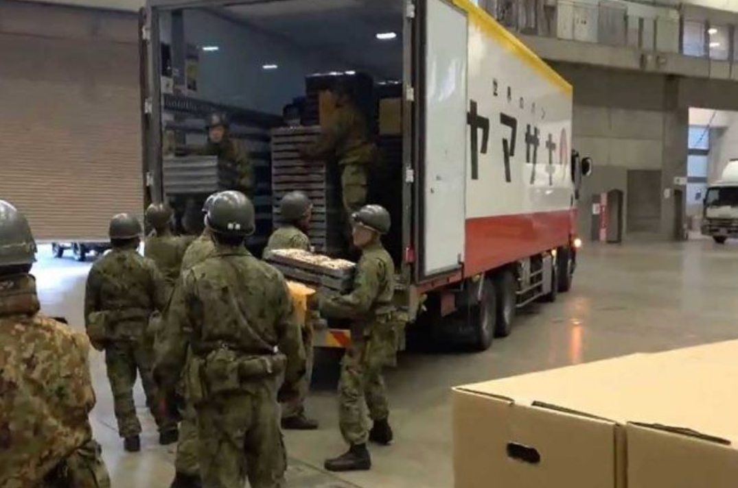 Las imágenes de camiones de Yamazaki Baking Co. siendo descargados por miembros de las Fuerzas de Autodefensa han resonado en las redes.