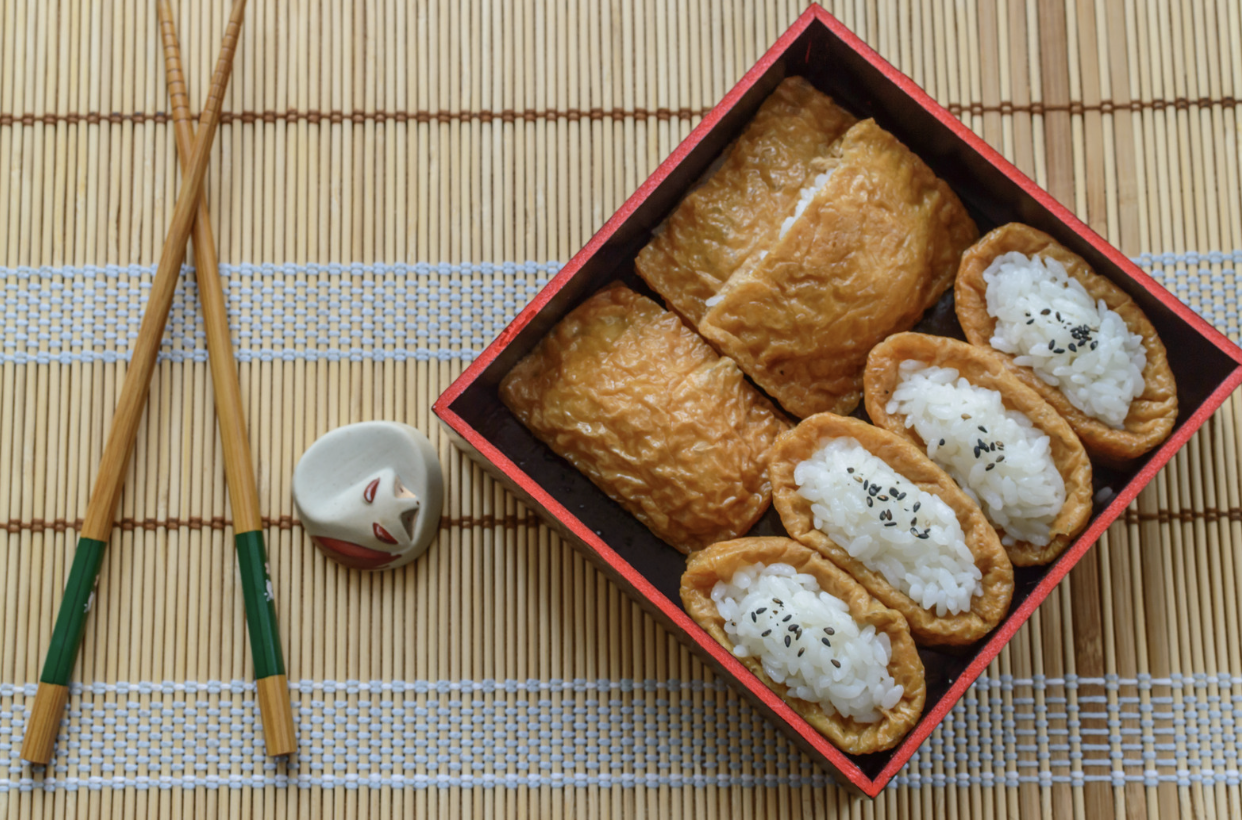 El inari sushi (稲荷寿司) consiste en bolsas de tofu frito, endulzadas y cocinadas en una salsa agridulce, rellenas de arroz avinagrado. Este plato también se conoce como «o-inari-san» entre otros nombres.