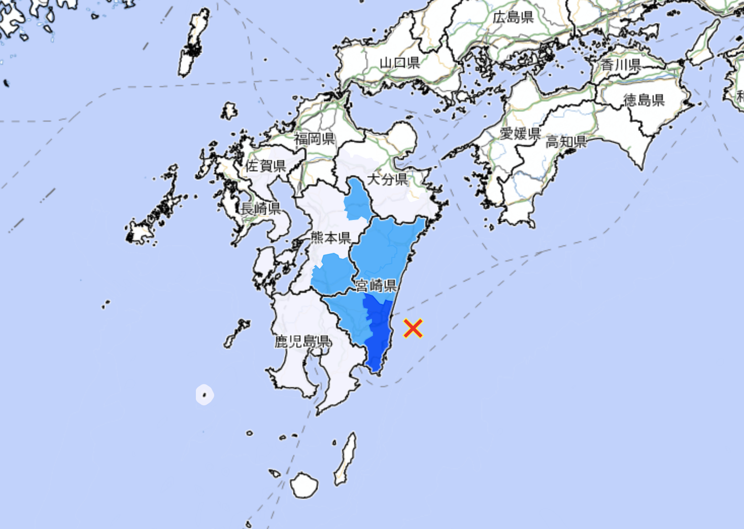 • Municipios: Varias localidades dentro de la prefectura de Miyazaki, como Tano, Kiyotake, y Sadowara, entre otros. También se reportaron sismos de esta intensidad en municipios de las prefecturas de Kumamoto, como el pueblo de Ubuyama, y el pueblo de Takamori en la prefectura de Kumamoto.