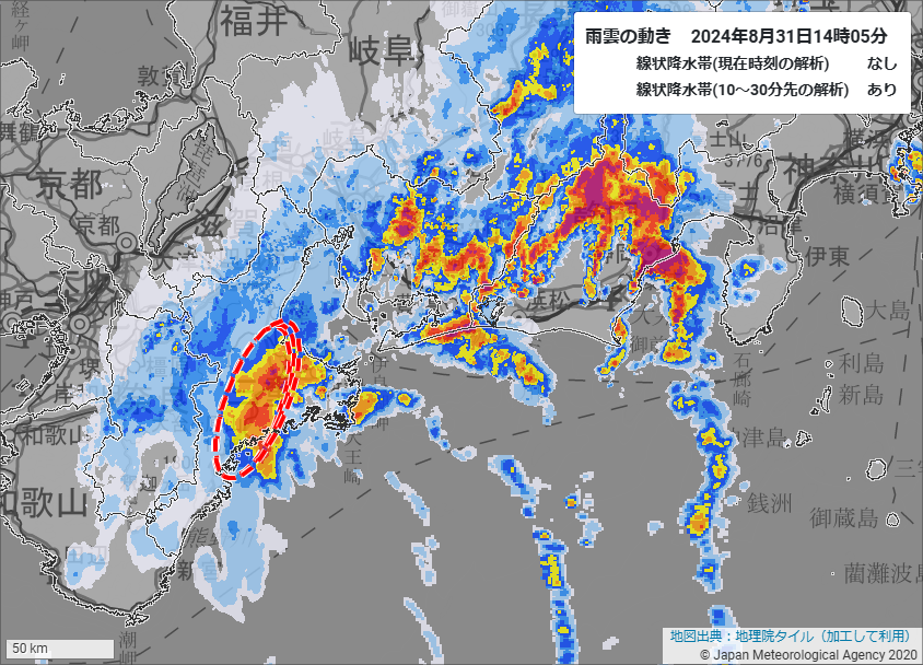 Kishocho atribuye el fenómeno a la formación de una banda de lluvia estacionaria conocida como «línea de precipitación en banda» o «線状降水帯» (senjō kōsuitai).