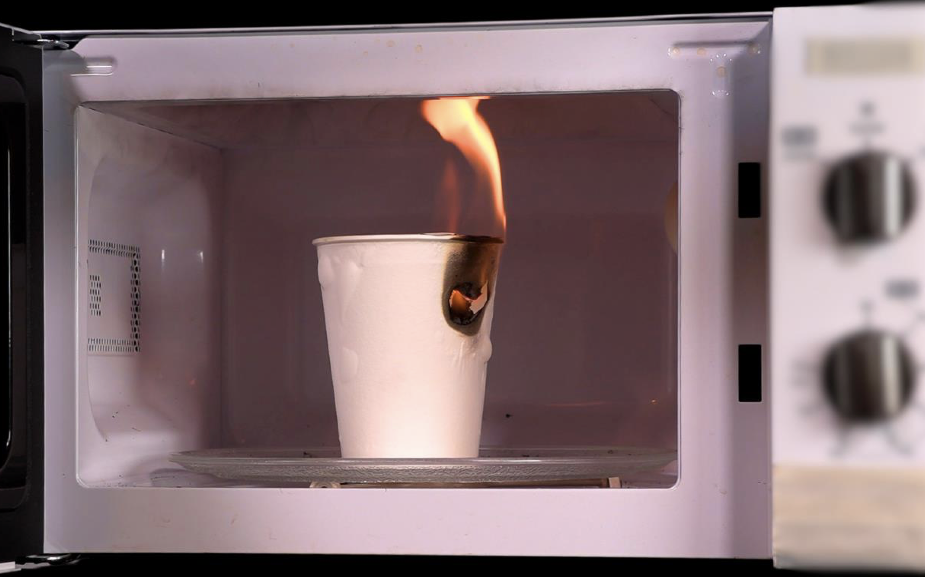 1. Uso del microondas para calentar fideos instantáneos en un envase no apto: Esto puede llevar a incendios, como se muestra en la imagen de la izquierda, donde se observan llamas dentro del microondas.