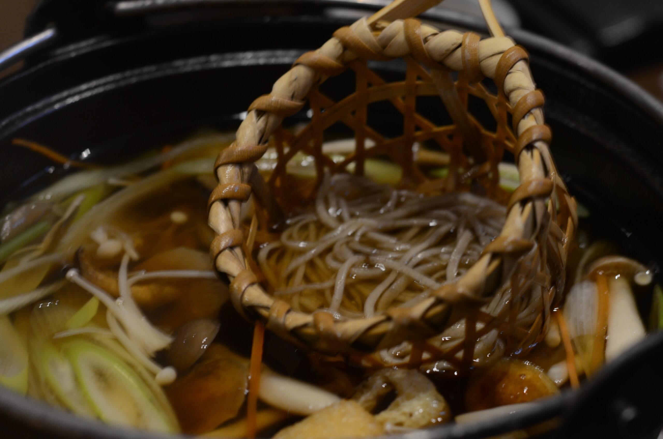 El tōji soba es un plato rústico y distintivo que consiste en sumergir fideos de soba en una canasta llamada tōji kago dentro de una olla con caldo caliente (soba-tsuyu).