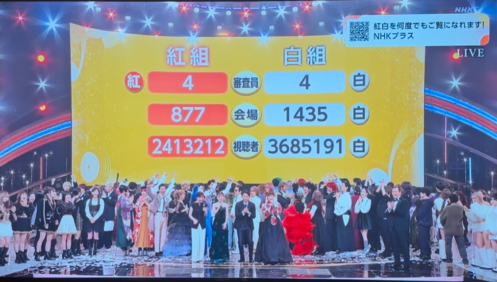 TOKIO.- En el evento anual más esperado de la música japonesa, el 75º Kōhaku Uta Gassen transmitido por NHK, el equipo blanco (白組), compuesto principalmente por artistas masculinos, se llevó la victoria frente al equipo rojo (紅組), conformado mayormente por artistas femeninas.