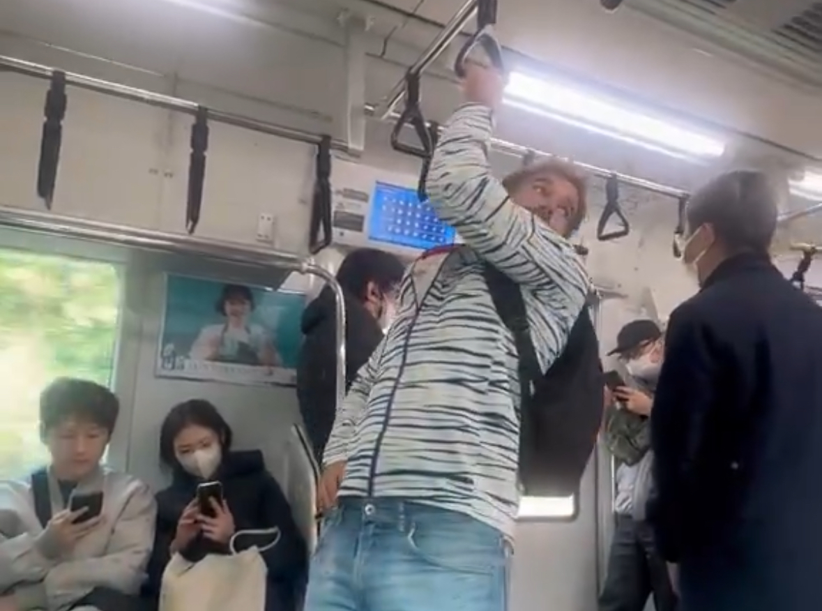 En la grabación, Cabré aparece haciendo movimientos extraños mientras viaja de pie y, en un momento, finge caerse sobre un pasajero japonés.