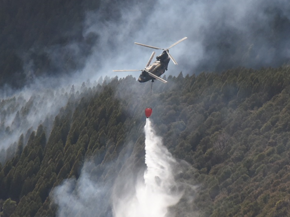 Dos helicópteros UH-1 de la Unidad Aérea del Área Central del Ejército de Autodefensa Terrestre (con base en Yao, prefectura de Osaka) llevaron a cabo la transmisión de imágenes. Actualmente, se están preparando para iniciar las operaciones de extinción del incendio a partir de mañana (día 11).