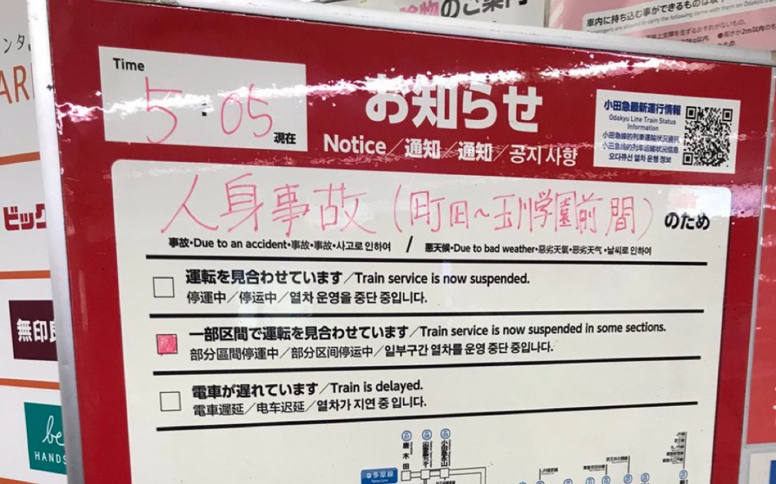 Según el aviso oficial, se trata de un “jinshin jiko” (人身事故), un término japonés que se usa cuando se suspende el servicio ferroviario por un incidente relacionado a una persona.
