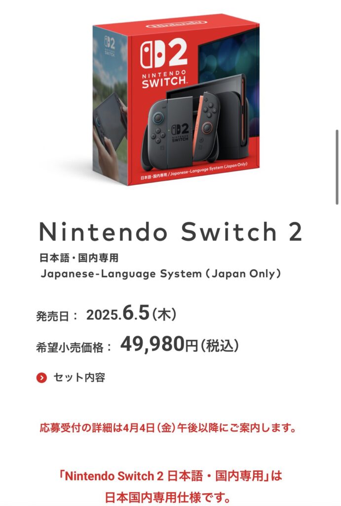 Esta edición especial se llama “Nintendo Switch 2 japonés – uso exclusivo en Japón” [Nintendo Switch 2 日本語・国内専用] y destaca por dos características clave: solo funciona en japonés y solo puede usarse con cuentas Nintendo configuradas para Japón.