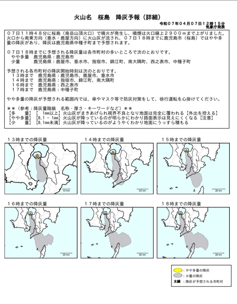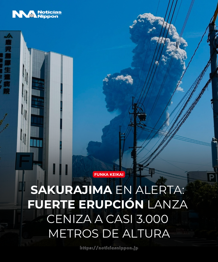 El volcán Sakurajima (cráter Minamidake) hizo erupción hoy a las 11:48 a. m., con una columna de humo que alcanzó los 2,900 metros de altura. Se prevé caída de ceniza hacia el sur del volcán, principalmente en áreas de la prefectura de Kagoshima.