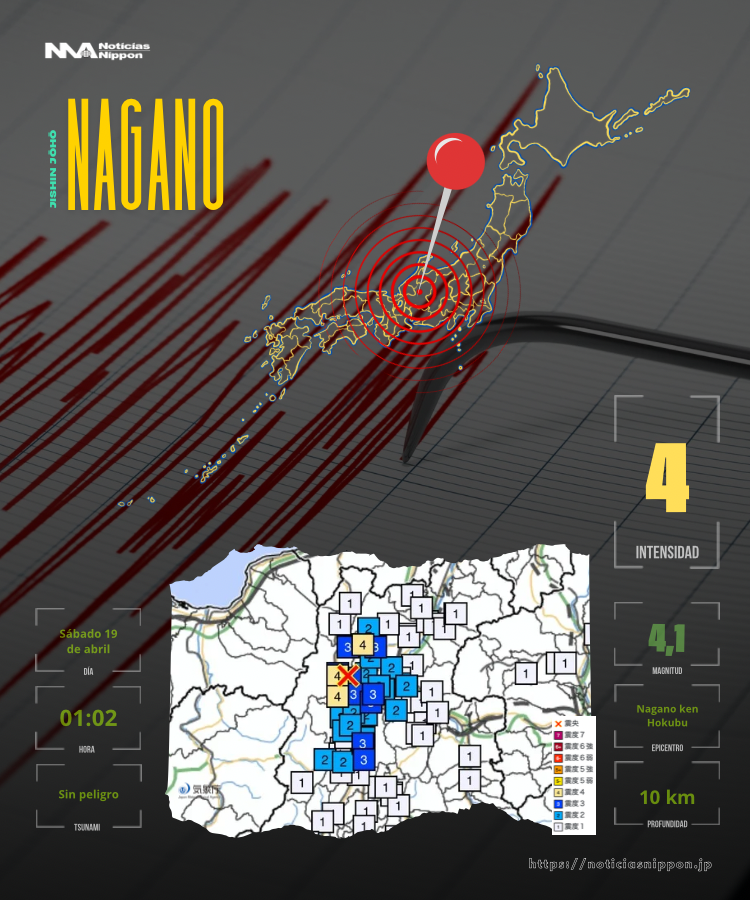 TOKIO.- Durante la madrugada del 19 de abril de 2025, a la 1:02 a. m., ocurrió un sismo en la parte norte de la prefectura de Nagano, en el centro de Japón.