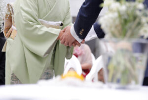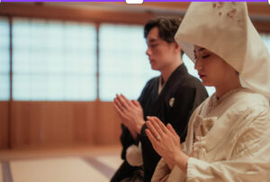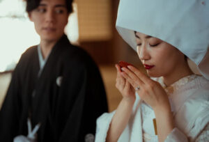 En una boda japonesa con trajes tradicionales (el novio con hakama y la novia con kimono blanco llamado “shiromuku”), frente al altar del santuario sintoísta, un sacerdote entrega las tres copas.