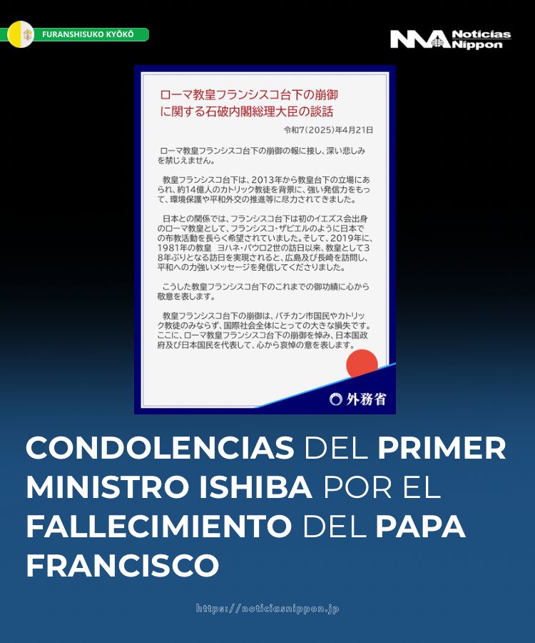 •Ishiba considera que la muerte del Papa representa una gran pérdida para el Vaticano, los católicos y toda la comunidad internacional.