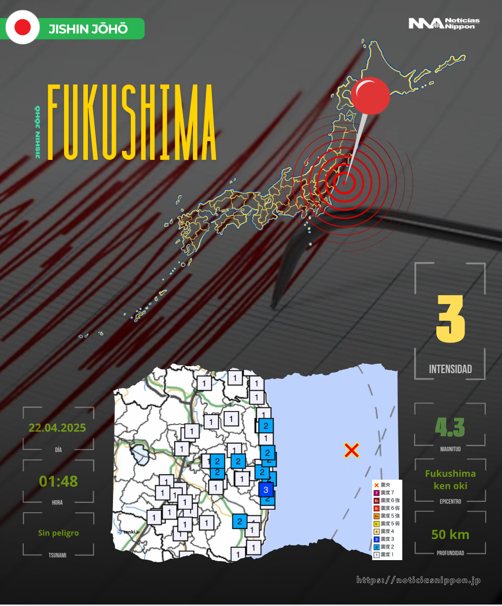TOKIO.- En la madrugada del martes 22 de abril, a las 1:48 a. m., ocurrió un terremoto en la costa de la prefectura de Fukushima, en el noreste de Japón.