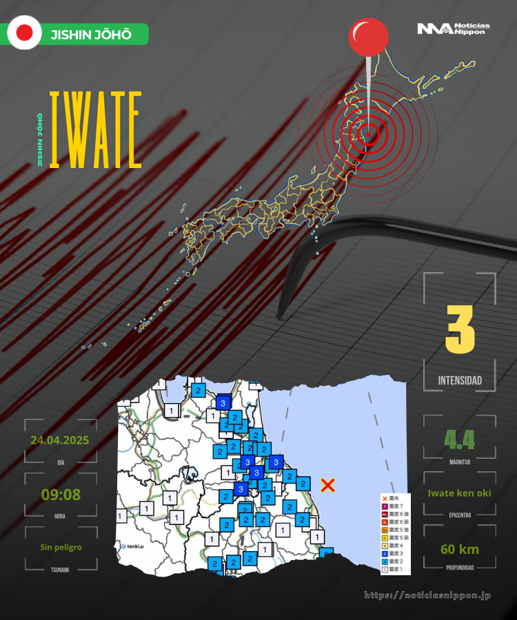 Según los datos técnicos, el epicentro se localizó en el mar frente a Iwate (岩手県沖), a una profundidad de unos 60 kilómetros. A pesar de ser un sismo moderado, las autoridades confirmaron que no existe riesgo de tsunami, por lo que no se emitieron alertas marítimas.