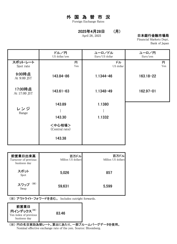 El Banco de Japón publicó los datos oficiales del mercado de divisas correspondiente al lunes 28 de abril de 2025.