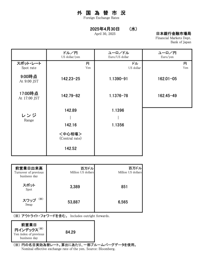 A las 9:00 a. m. (JST): ¥142.23–25 por dólar.