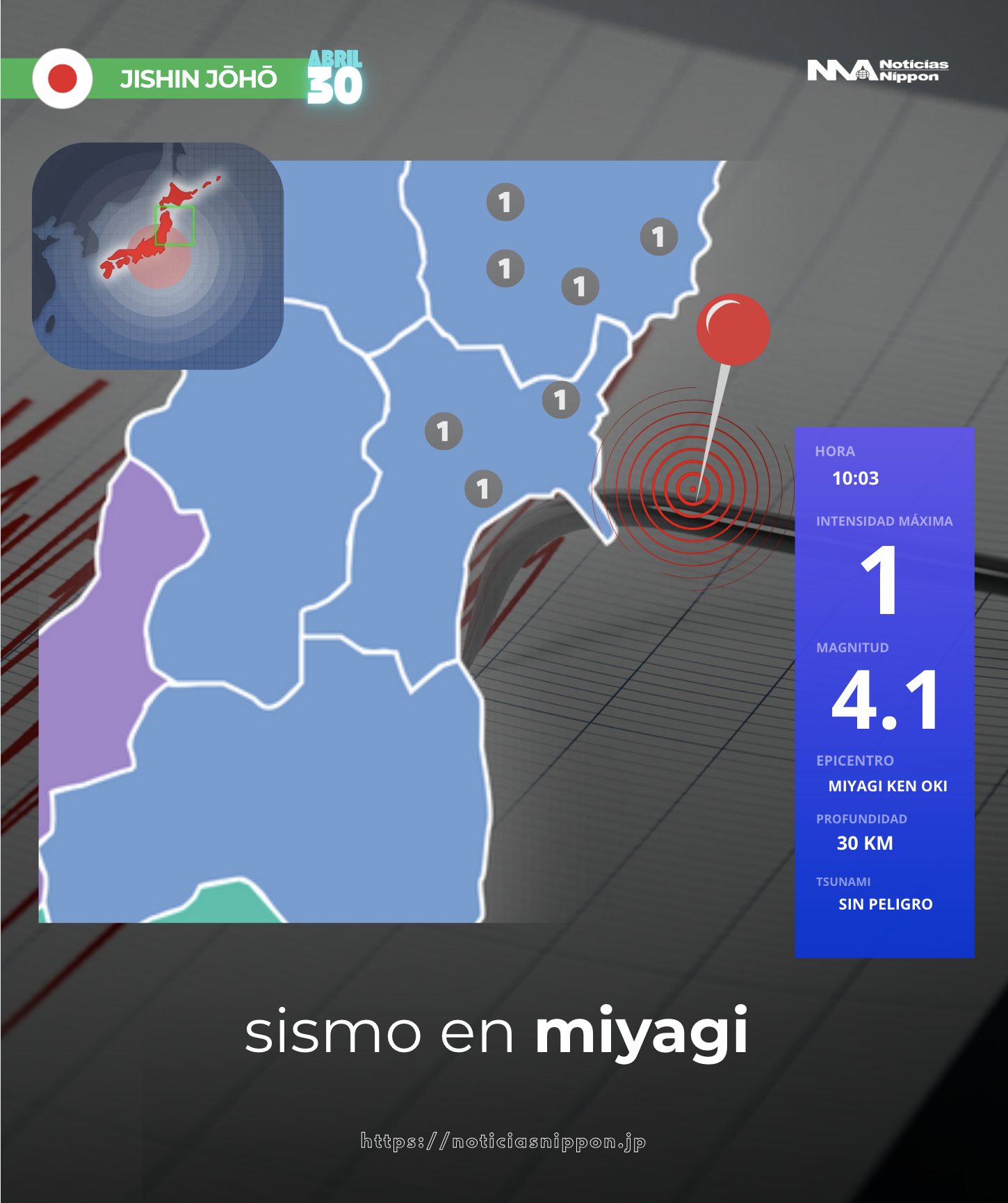 La mañana del miércoles, a las 10:03, se registró un movimiento sísmico leve frente a la costa de la prefectura de Miyagi, en la región de Tōhoku (noreste de Japón).