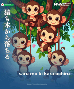 Uno de los más conocidos y utilizados en el día a día, especialmente en situaciones donde alguien ha cometido un error, es: 「猿も木から落ちる」(saru mo ki kara ochiru), que literalmente significa: “Hasta los monos se caen de los árboles”.