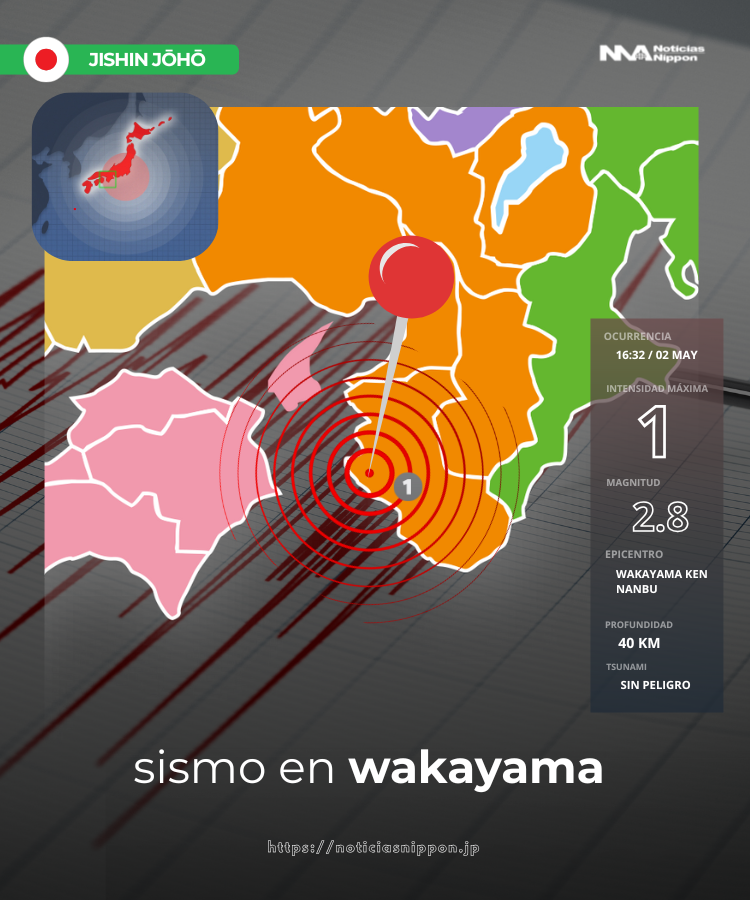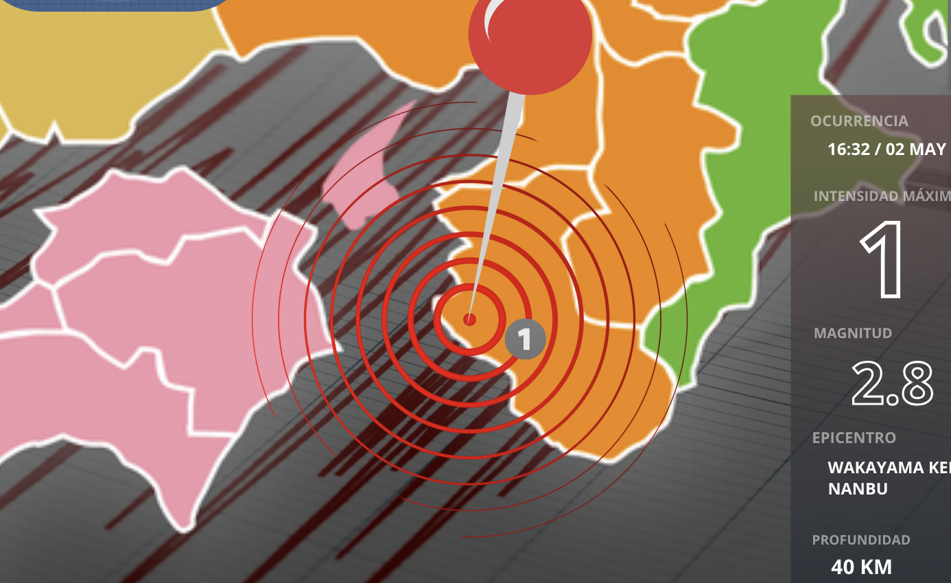 La Agencia Meteorológica de Japón (JMA) informó que a las 16:32 de la tarde, se registró un sismo de magnitud 2.8con epicentro en el sur de la prefectura de Wakayama.