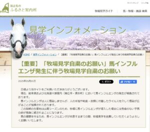 La Asociación Japonesa de Criadores de Caballos Ligeros (日本軽種馬協会) actualizó su sitio web oficial para pedir al público que evite temporalmente las visitas a los criaderos y establos.