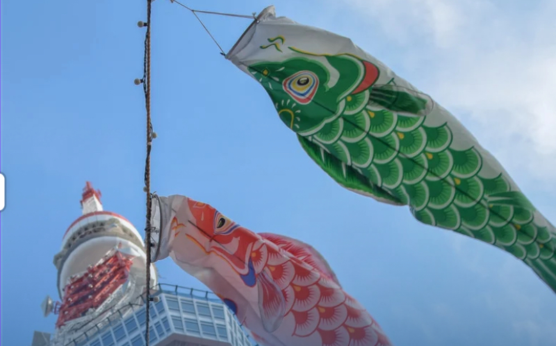 A lo largo del país, es habitual ver flamear carpas de tela llamadas koinobori, que representan carpas nadando río arriba: un símbolo de fuerza y superación, inspirado en una leyenda china. En algunos lugares, como la Torre de Tokio, se colocan hasta 333 carpas de colores como espectáculo visual para grandes y chicos.