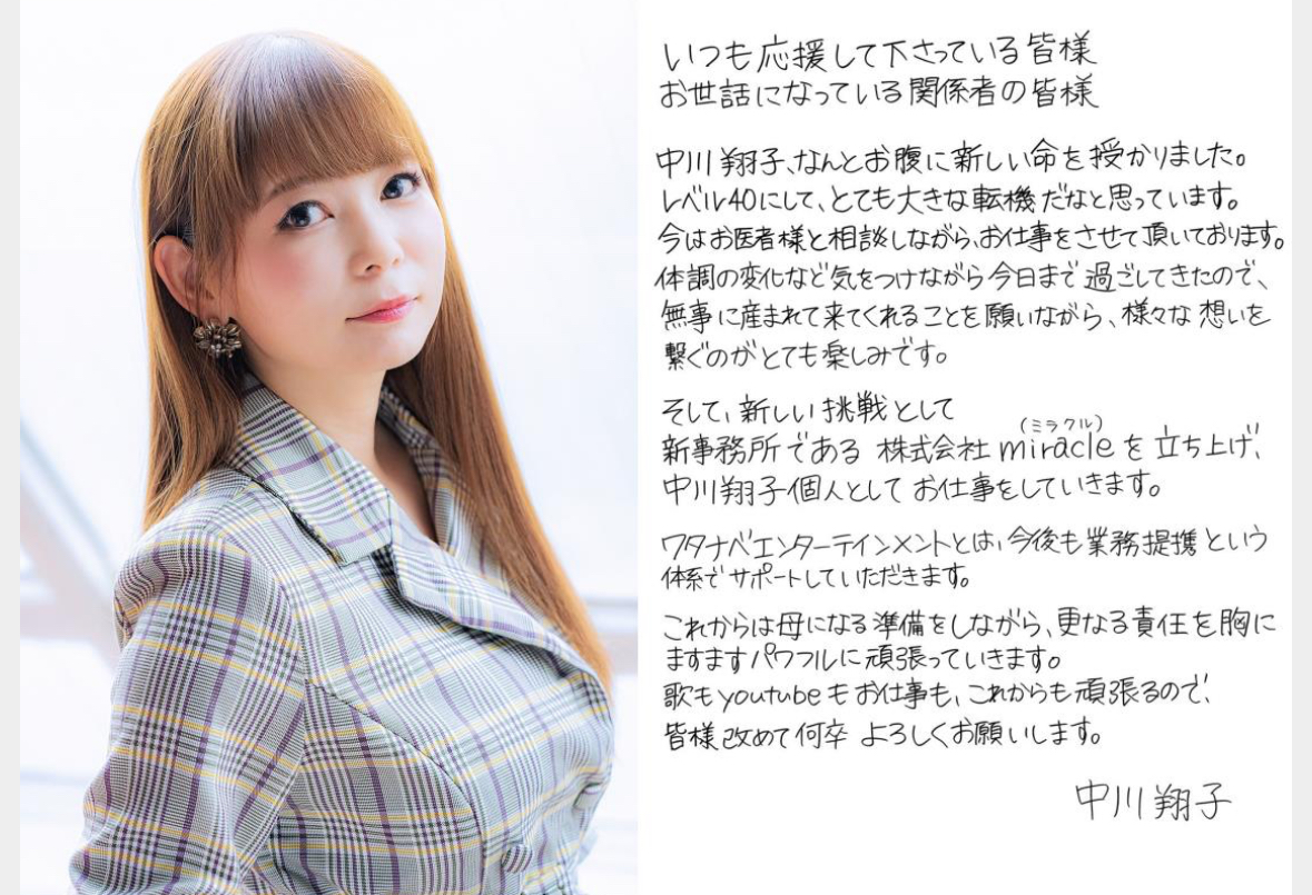 A través de las redes sociales, la popular “Shokotan”— reveló oficialmente que está embarazada de su primer hijo y que ha fundado su propia agencia llamada miracle(ミラクル), con la cual gestionará su carrera de manera independiente. Esta noticia llega en un día muy simbólico para ella: su cumpleaños.