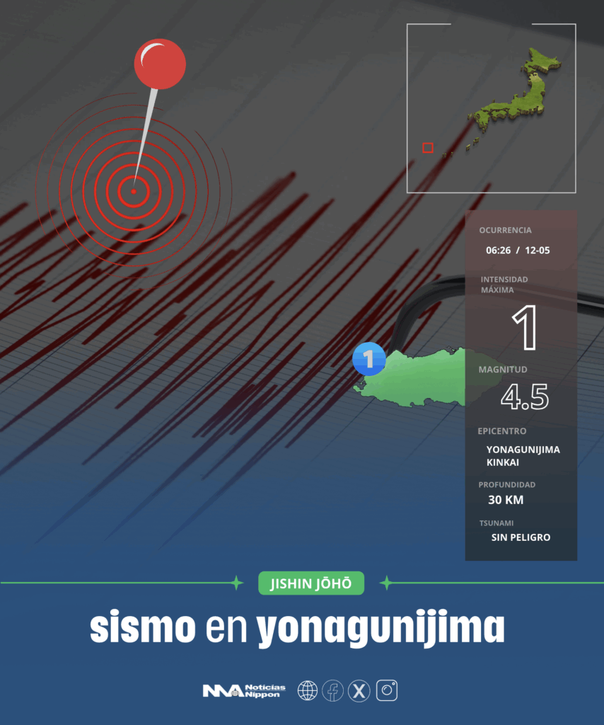 La Agencia Meteorológica de Japón (JMA) reportó que el sismo tuvo una magnitud de 4.5 y se originó a una profundidad de 30 kilómetros en el mar cercano a Yonaguni (与那国島近海).