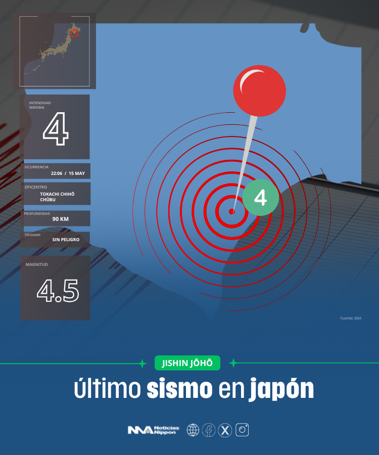 El sismo se registró exactamente a las 22:06 horas, con una magnitud estimada de 4.5 en la escala de Richter y una profundidad de 90 kilómetros, según informó la Agencia Meteorológica de Japón (JMA).
