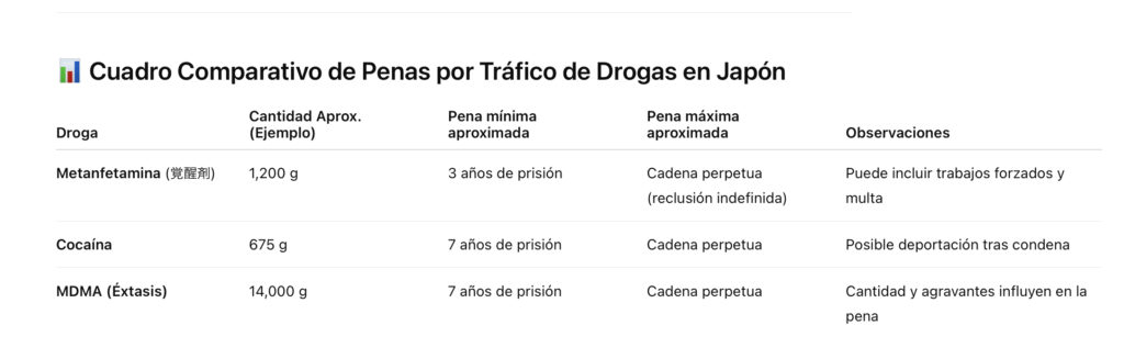 Nota: Las penas pueden aumentar si se demuestra agravante (red criminal, reincidencia, intención de venta o distribución, etc.). Japón aplica penas severas incluso para cantidades menores de droga.