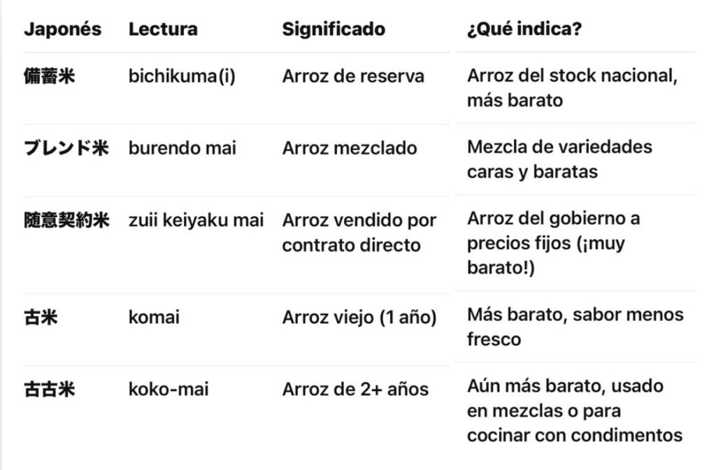 - Contrato directo o negociado (随意契約): modalidad reciente donde el gobierno vende arroz directamente a distribuidores a precios fijos de unos 2,000 yenes por 5 kg. Este arroz empezó a llegar a los supermercados a finales de mayo.
