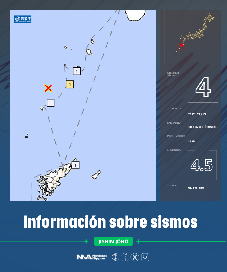 Hoy al mediodía se registró un sismo de magnitud 4.5 en el mar cercano a las islas Tokara, al sur de la prefectura de Kagoshima, según informó la Agencia Meteorológica de Japón.