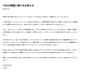 Según fuentes cercanas, el día anterior, el 24 de junio, Jōshima y Matsuoka se reunieron en privado. Evaluaron la situación y, con una mezcla de tristeza y responsabilidad, decidieron que seguir adelante como TOKIO ya no era viable. Después informaron a Kokubun, quien —aunque suspendido de sus actividades— aceptó la decisión con comprensión.