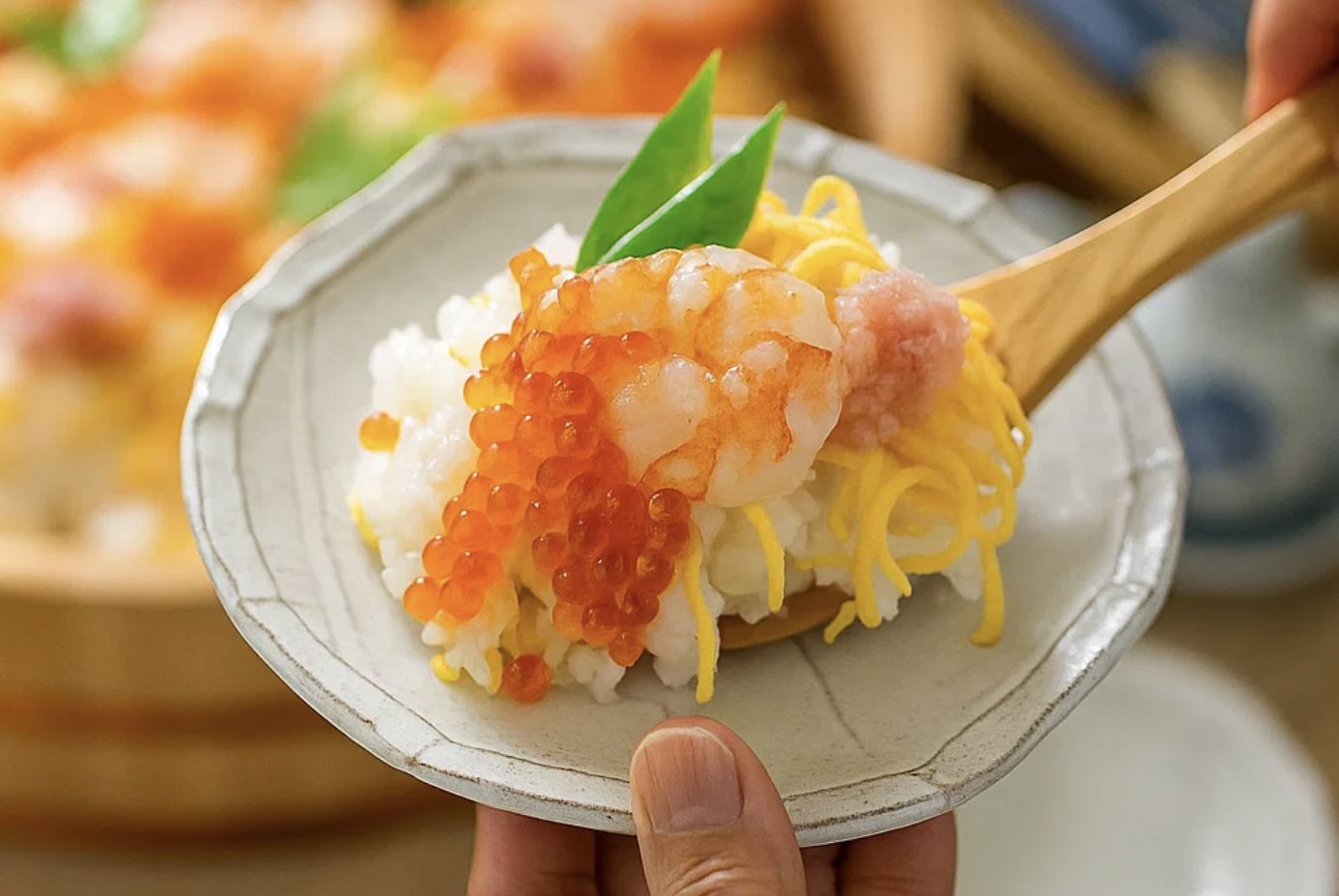 Hoy en día, el chirashi-zushi se sirve en días de fiesta como el Hinamatsuri (Día de las Niñas) o cumpleaños familiares, donde cada ingrediente tiene un significado: el camarón representa longevidad, los huevos revueltos simbolizan la riqueza, las verduras encurtidas traen color y salud.