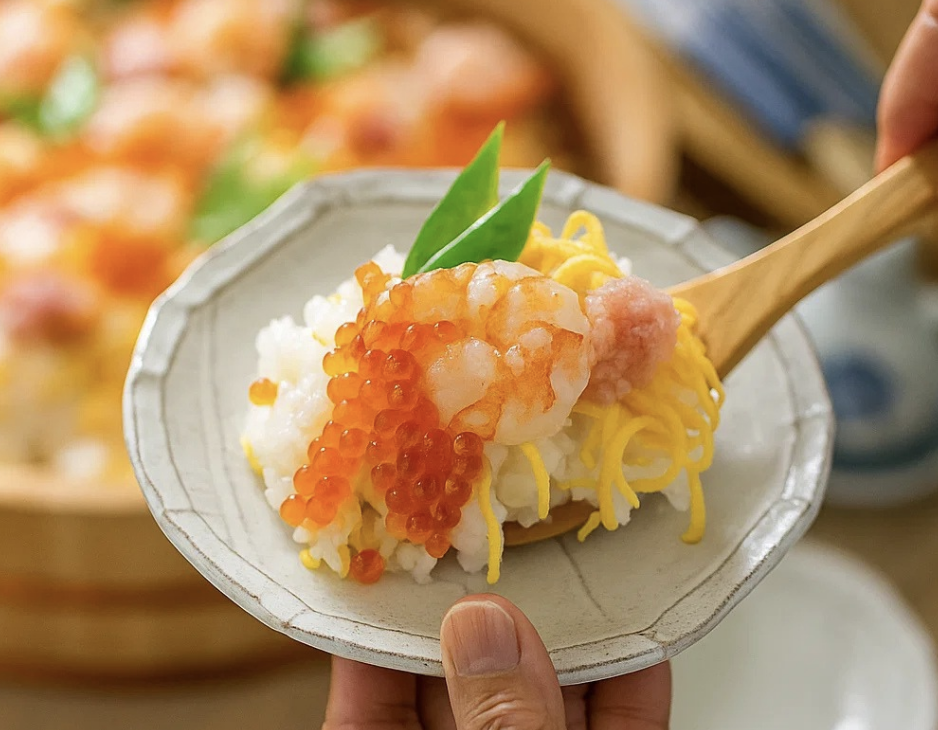 Hoy en día, el chirashi-zushi se sirve en días de fiesta como el Hinamatsuri (Día de las Niñas) o cumpleaños familiares, donde cada ingrediente tiene un significado: el camarón representa longevidad, los huevos revueltos simbolizan la riqueza, las verduras encurtidas traen color y salud.