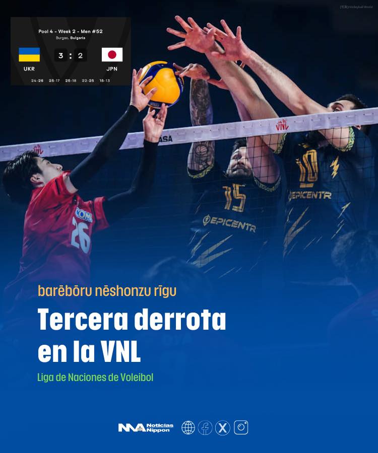 En un encuentro lleno de giros y tensión hasta el último punto, la selección masculina de voleibol de Japón, actualmente número 6 del ranking mundial, cayó 2-3 (26-24, 17-25, 18-25, 25-22, 13-15) frente a Ucrania (ranking 13) en su tercer partido de la segunda semana del torneo de la Nations League (VNL) 2025.