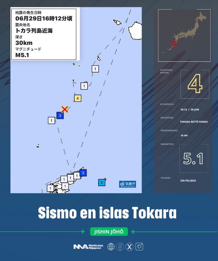 📰 Este domingo por la tarde, un sismo de magnitud 5.1 se registró en el mar cercano a las islas Tokara, al sur de Kyūshū, sacudiendo con fuerza las remotas comunidades isleñas de Kagoshima y parte de Amami.