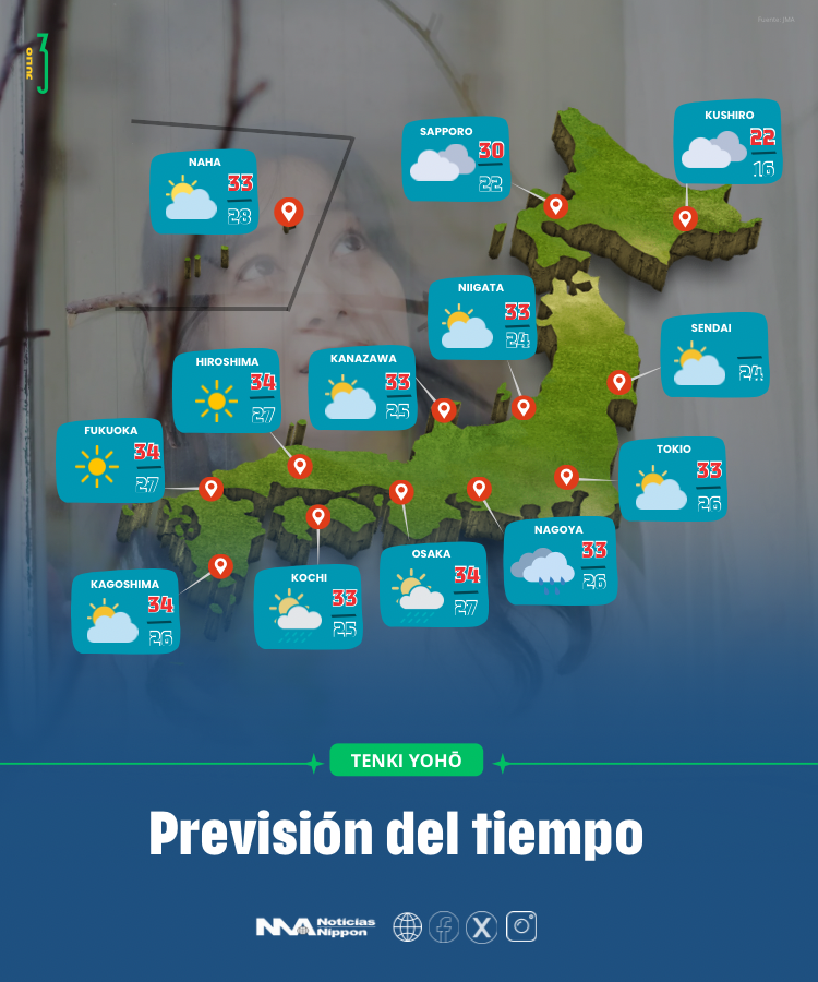 En el este de Japón, incluyendo Tokio, Nagoya y Yokohama, el panorama es engañoso. Aunque habrá ratos de sol, la humedad será abrumadora. Se esperan temperaturas cercanas a los 33 °C, pero con una sensación térmica superior, que podría rozar los 37 °C en zonas interiores.