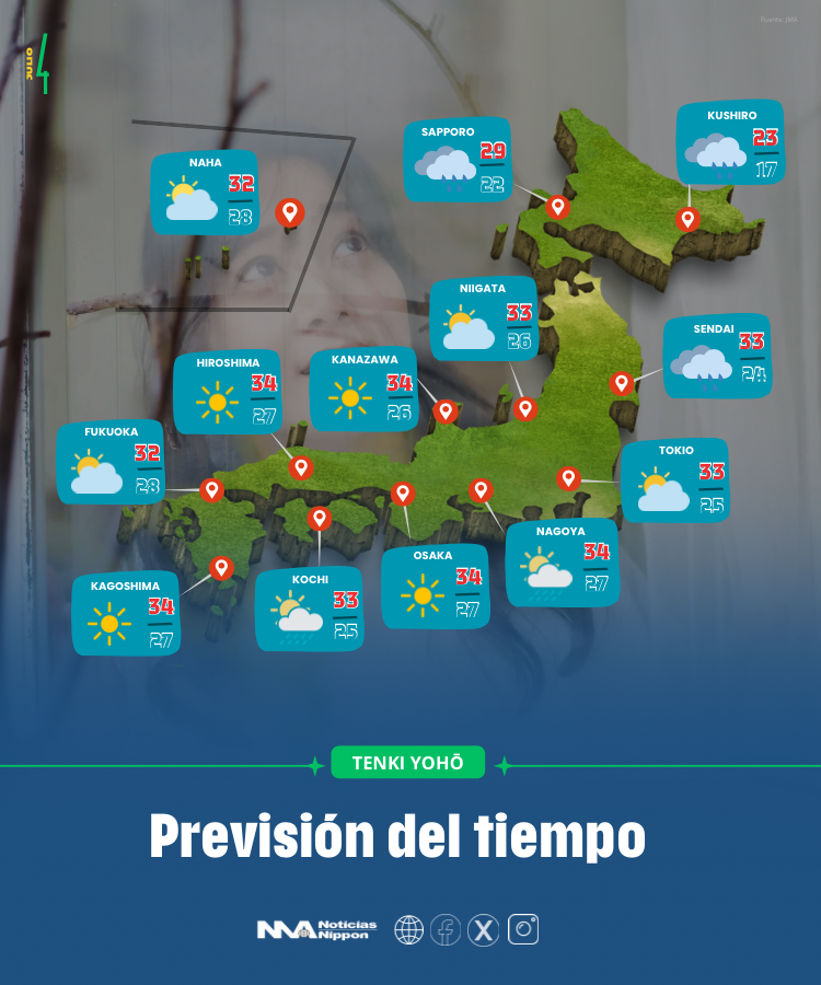 Hoy el clima en Japón viene con dos caras: mientras el norte se prepara para mojarse, el resto del país sigue sofocado bajo un sol que no da tregua. La típica humedad del verano japonés se deja sentir con fuerza, incluso donde llueve.
