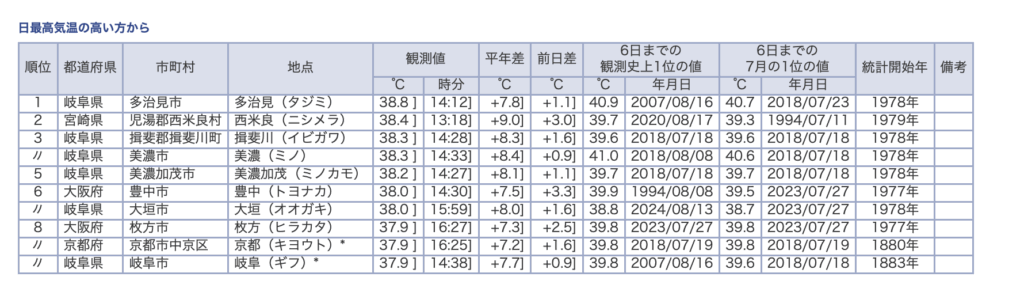 La temperatura más alta registrada este año (38.8°C) en Tajimi superó el récord histórico para esta fecha, que se había dado en 2007, alcanzando los 40.7°C. Esta marca histórica fue registrada el 23 de julio de 2018.