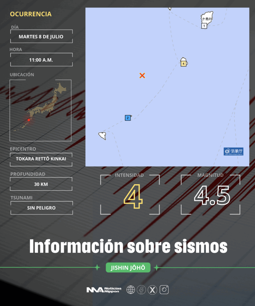 A las 11:00 a. m. de este martes , se registró un sismo en la región del mar cercano a las Islas Tokara, en la prefectura de Kagoshima, al sur de Japón.