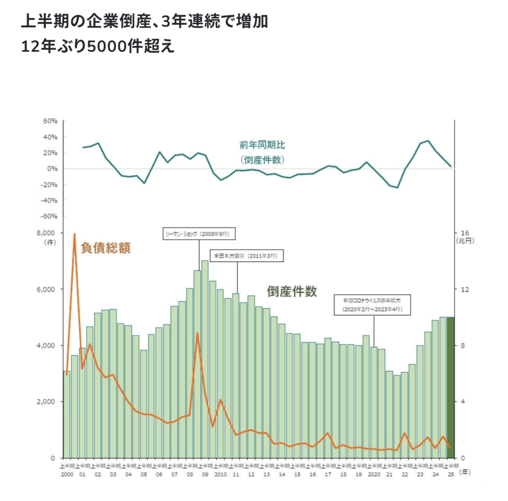 Entre enero y junio de este año, 5,003 empresas iniciaron procedimientos legales por insolvencia (con deudas superiores a 10 millones de yenes), lo que supone 116 casos más que en el mismo periodo de 2024.