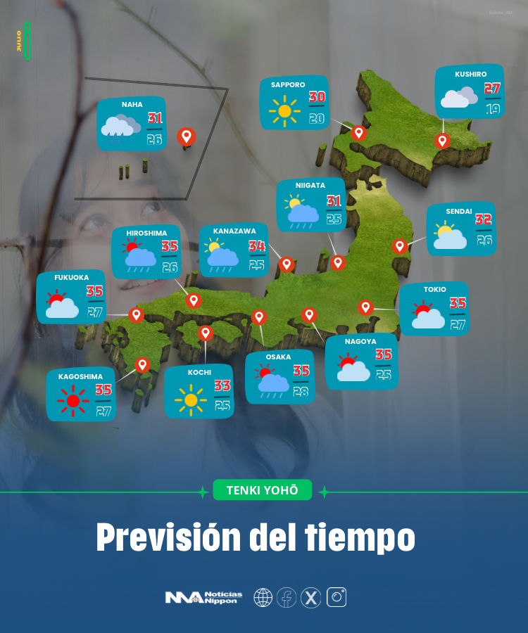 • Temperaturas: Máximas de 34-36 °C en áreas como Nagoya y Gifu.