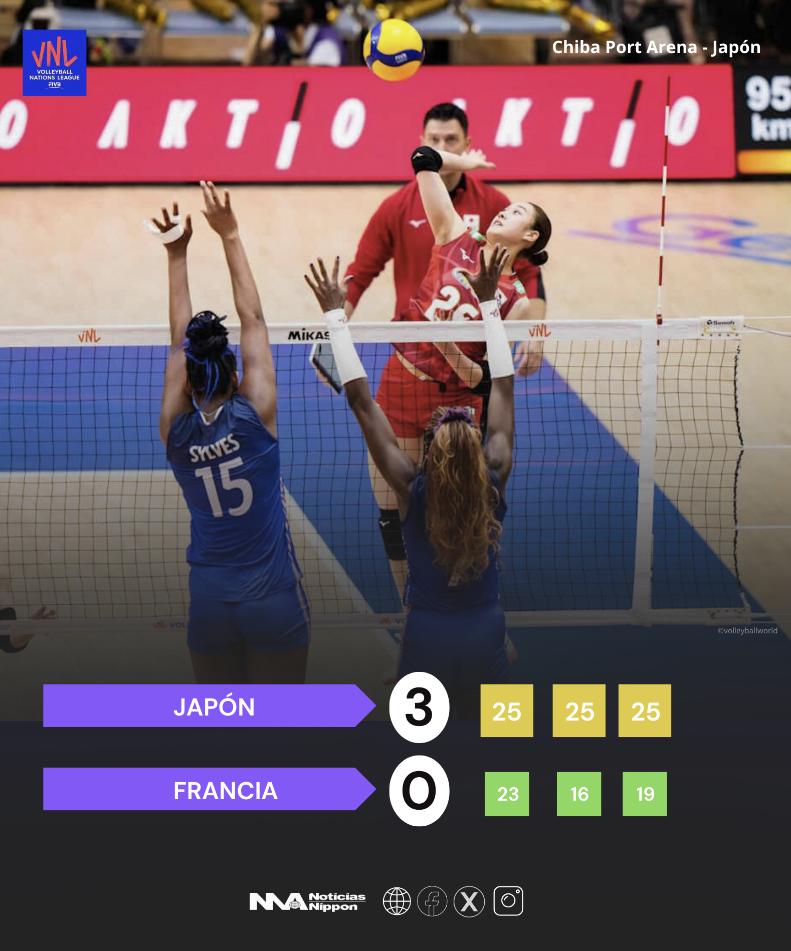 Ante más de 6.000 personas que llenaron el Chiba Port Arena, el equipo capitaneado por la estrella Ishikawa Mayu se impuso con autoridad a una Francia en ascenso (rango mundial 17°), por 3 sets a 0 (25-23, 25-16, 25-19).