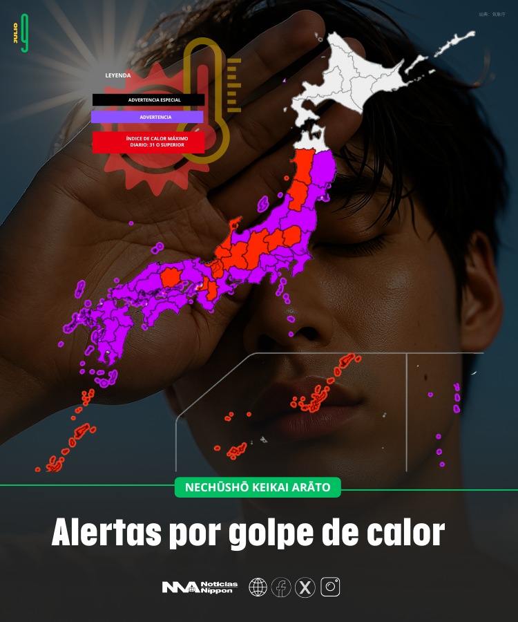 El Ministerio de Medio Ambiente y la Agencia Meteorológica de Japón emitieron una Alerta de Advertencia por Golpe de Calor (熱中症警戒アラート) para 32 prefecturas, desde Kyūshū hasta Tōhoku.