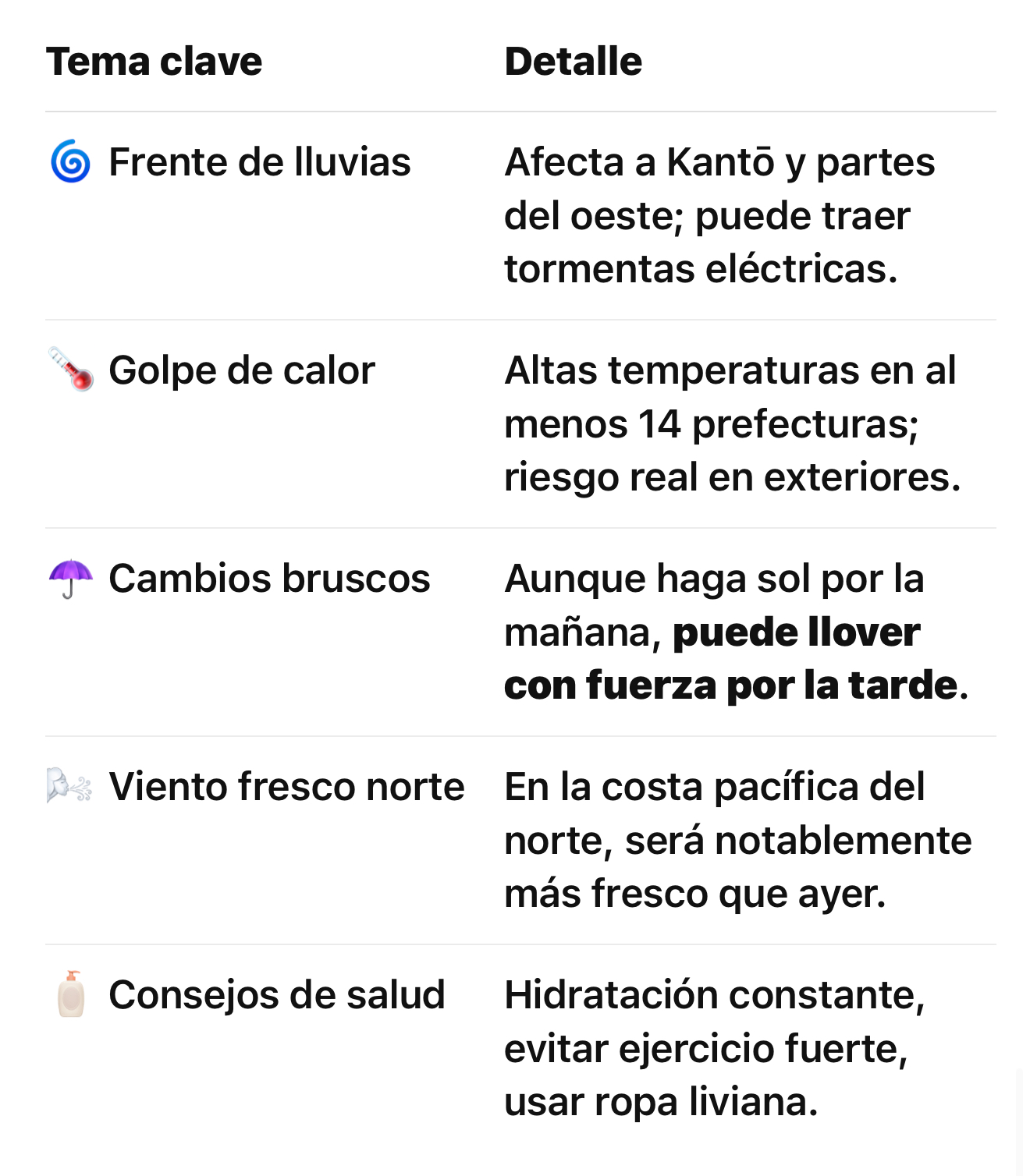 - En cuanto al calor, el centro de Tokio, Yokohama y Saitama alcanzaron los 35°C antes del mediodía. Se prevé que la llegada de la lluvia ayude a enfriar el ambiente hacia la noche, pero el riesgo de golpe de calor permanece durante las horas más activas del día.