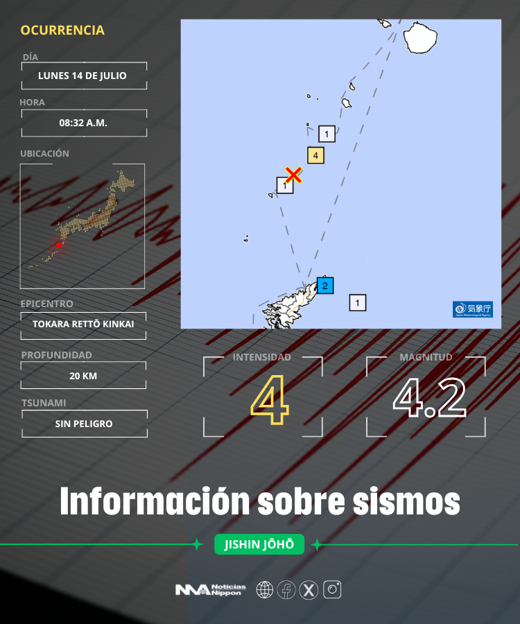 En la mañana de este lunes, a las 08:32, un terremoto de magnitud 4.2 se registró en el mar cercano a las Islas Tokara, un archipiélago volcánico al sur de la prefectura de Kagoshima.