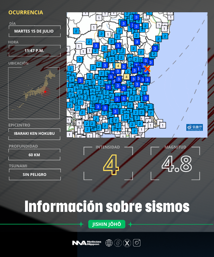 Un sismo de magnitud 4.8 sacudió la región norte de la prefectura de Ibaraki a las 23:47 de la noche del martes, según informó la Agencia Meteorológica de Japón (JMA).