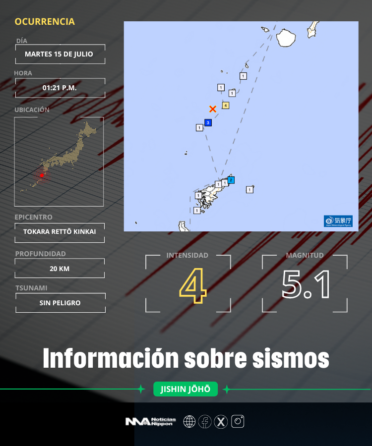 La Agencia Meteorológica de Japón (気象庁) emitió el reporte oficial a las 13:24, confirmando que no existe riesgo de tsunami, pero el movimiento fue claramente perceptible en varias islas de la región.