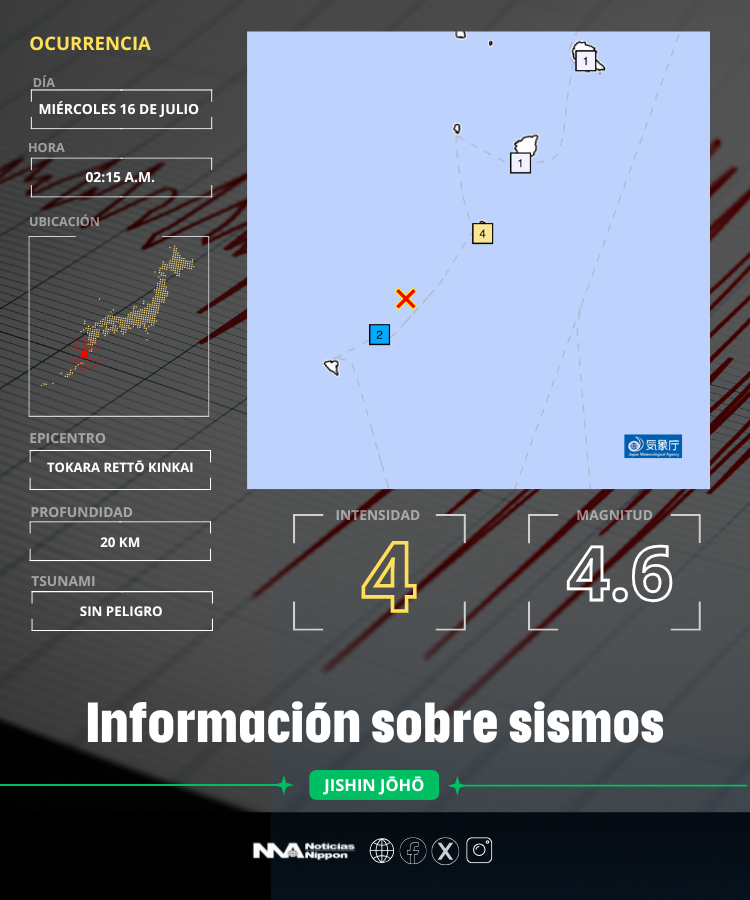 Un temblor de magnitud 4.6 se sintió durante la madrugada en el mar cercano a las islas Tokara, al sur de Kyushu.