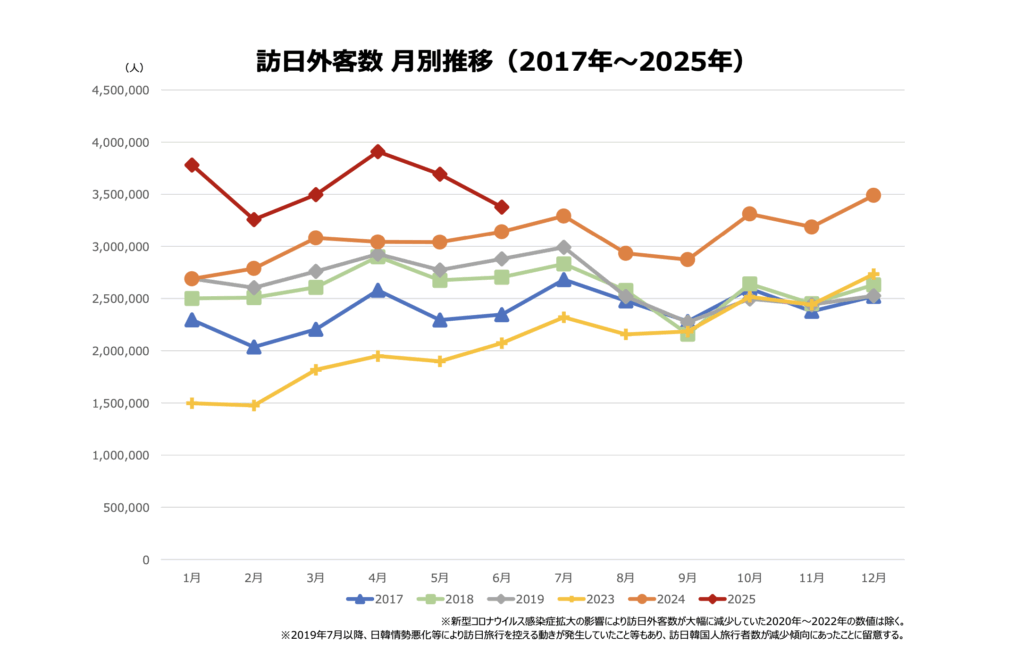 Desde julio de 2019 hubo una caída de visitantes surcoreanos por tensiones diplomáticas, especialmente relevante para el mercado japonés.