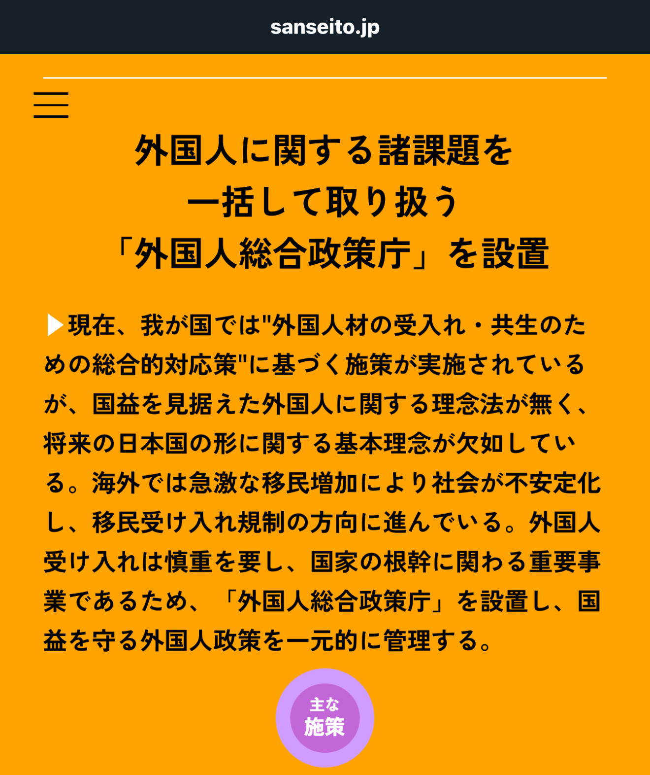Para la campaña electoral al Senado, el partido político Sanseitō publicó en su sitio web oficial un conjunto de propuestas que buscan reformar de manera profunda la política migratoria de Japón.